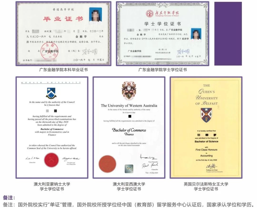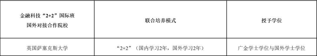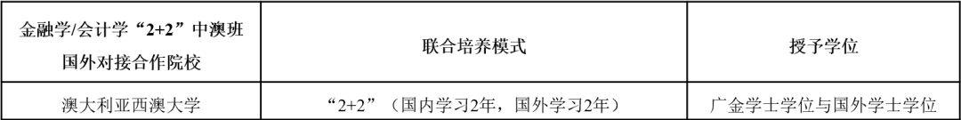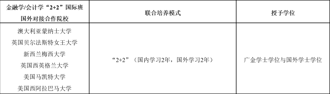 ② “2+2”培养模式是指学生在国内学习2年,在国外学习2年,毕业时广东金融学院颁发毕业证书、授予学士学位,国外合作院校授予学士学位。