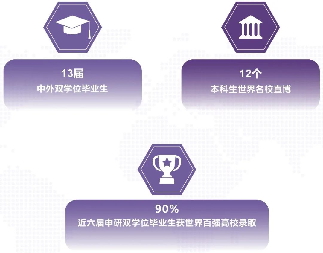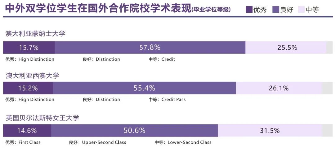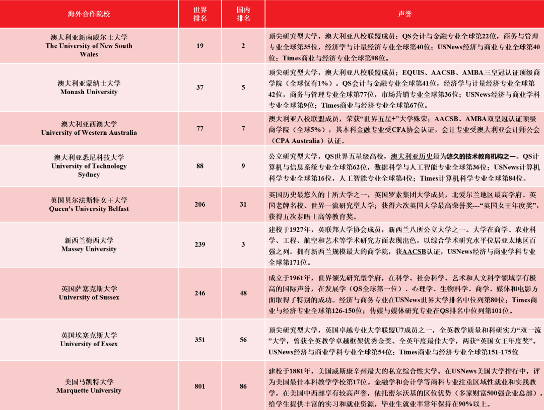 ⚫就业升学国际化90%以上的近六届中外双学位申研毕业生能进入哥伦比亚大学、芝加哥大学、帝国理工学院、伦敦大学学院、墨尔本大学、新加坡国立大学、香港大学等世界百强名校读研深造;其中12名中外双学位毕业生以本科生身份获得世界名校博士全额奖学金录取;就业遍布欧洲开发银行、美国银行、四大会计师事务所等世界行业领军机构。
