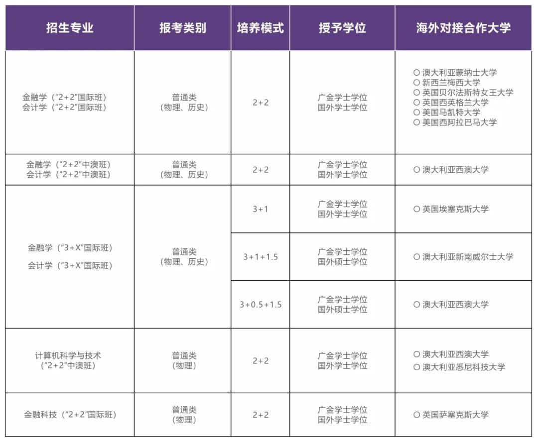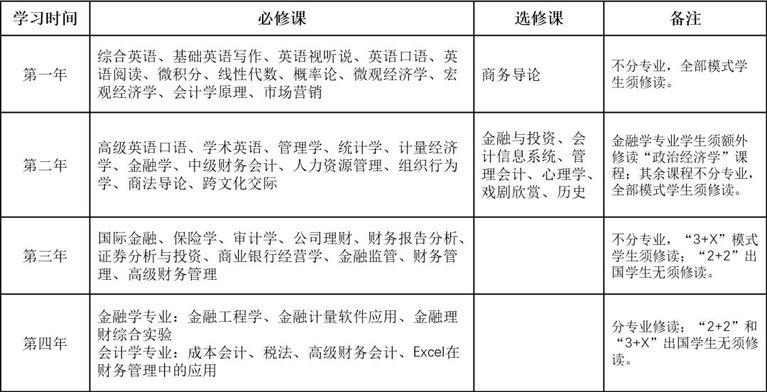 金融学(“2+2”国际班)、会计学(“2+2”国际班)、金融学(“2+2”中澳班)、会计学(“2+2”中澳班)、金融学(“3+X”国际班)、会计学(“3+X”国际班)