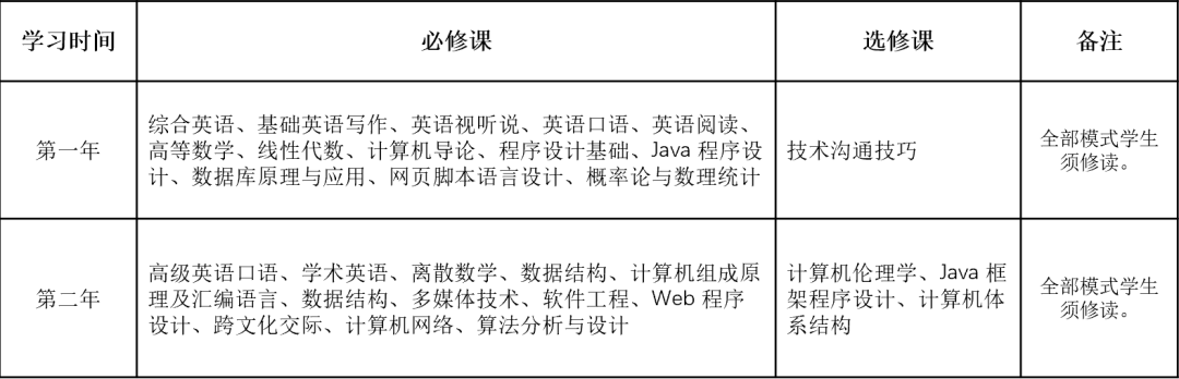 备注:以上专业课除高等数学、离散数学、技术沟通与技巧课程外,其余专业课均使用英文参考书及教学材料,全英/双语授课,英语考核;本专业课程以学校2025级相应人才培养方案为准。