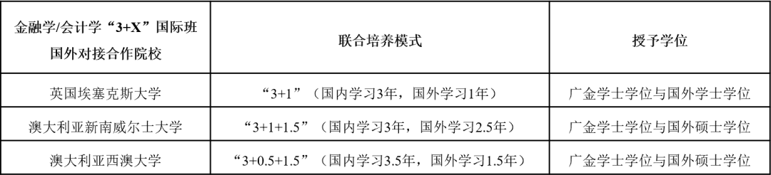 ③ “3+X”培养模式是指学生在国内学习3年,在国外学习1-2.5年。“3+1”双本科模式学生本科第四年赴英国埃塞克斯大学学习1年,毕业时广东金融学院颁发毕业证书、授予学士学位,埃塞克斯大学授予学士学位;“3+1+1.5”模式学生本科第四年赴澳大利亚新南威尔士大学学习1年本科课程,满足升读条件后继续在新南威尔士大学学习1.5年研究生课程,毕业时广东金融学院颁发毕业证书、授予学士学位,新南威尔士大学授予硕士学位;“3+0.5+1.5”模式学生本科第四年第一学期在广东金融学院学习澳大利亚西澳大学0.5年研究生课程,满足升读条件后第二学期赴西澳大学继续学习1.5年研究生课程,毕业时广东金融学院颁发毕业证书、授予学士学位,西澳大学授予硕士学位。