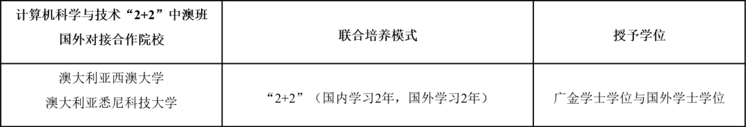 计算机与科学技术专业采用“2+2”中外联合培养双学位人才培养模式,第一、二学年在我校学习,符合所选国外合作院校入读条件后,第三、四学年赴国外合作院校学习,完成学业后颁发我校本科毕业证书及授予学士学位,国外合作院校授予学士学位。未达出国条件的学生,按计算机科学与技术普通类专业人才培养方案在广东金融学院继续修读第三、四学年课程,完成学业后颁发我校本科毕业证书及授予学士学位。