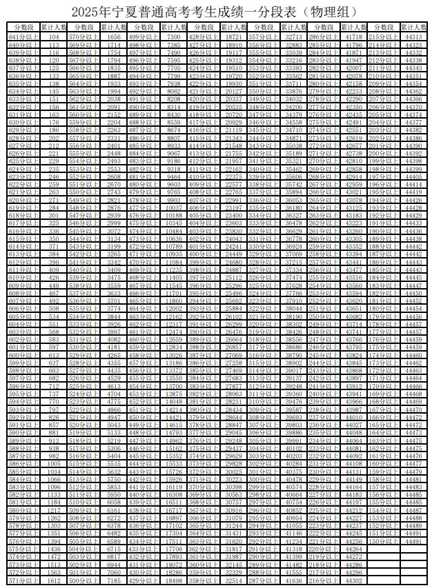 文章来源:宁夏教育考试院 2025年宁夏普通高考考生成绩一分段统计表