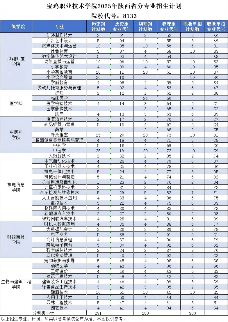 宝鸡职业技术学院2025年陕西省分专业招生计划