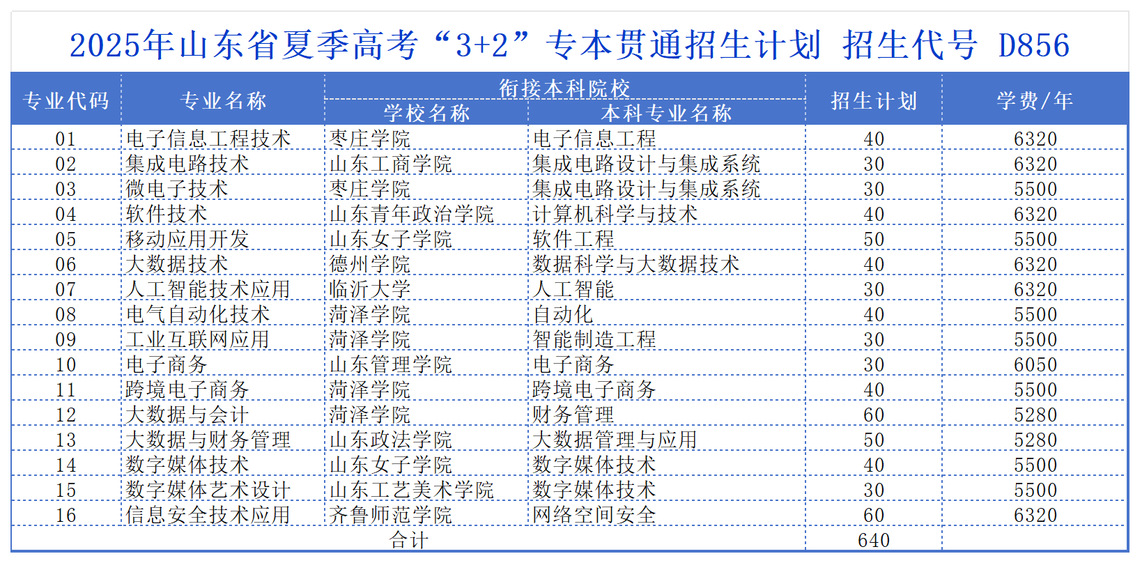2025年山东省夏季高考“3+2”专本贯通招生计划