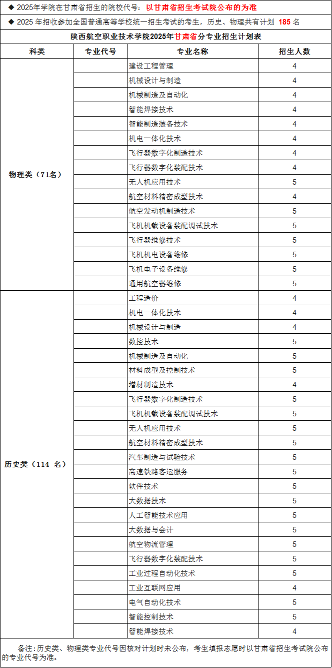 陕航职院2025年甘肃省招生专业计划表
