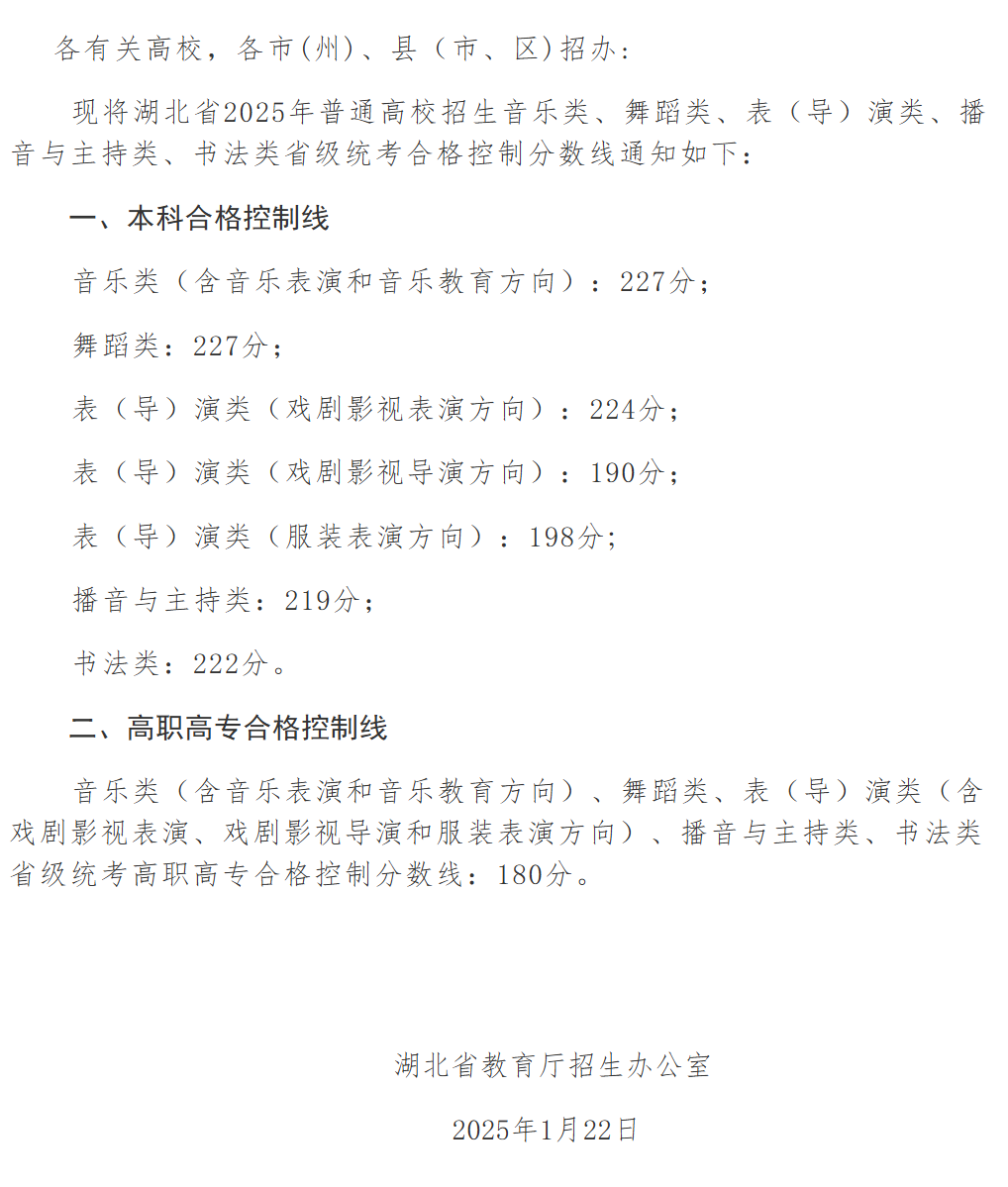 【普招.政策】省招委关于湖北省2025年音乐类、舞蹈类、表(导)演类、播音与主持类、书法类省级统考合格控制分数线的通知