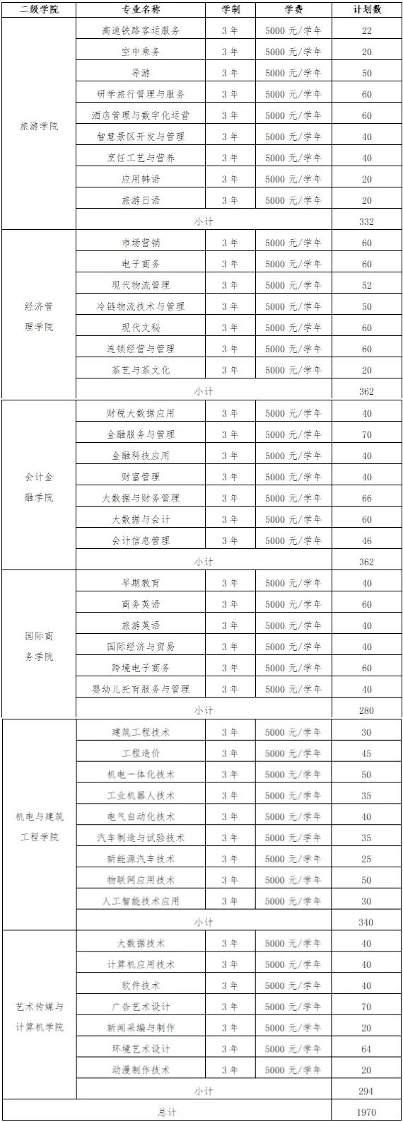 普通类招生计划为1970人,文、理、三校兼收。考试科目:文化素质考试+职业技能测试。