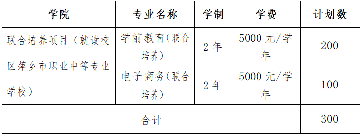 联合培养项目招生计划300人,招收与招生专业相同或相近专业(同一专业大类)的中等职业学校(含技工学校)应届毕业生,培养地点设在萍乡市职业中等专业学校。考试科目:文化素质考试+职业技能考试。
