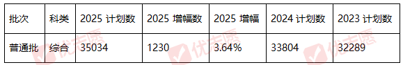 2025年海南本科普通批综合类招生计划数为35034人,较2024年增加1230人,增幅为3.64%。