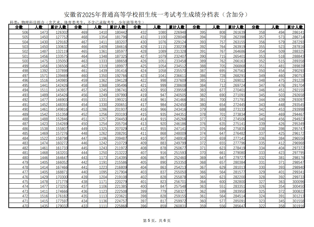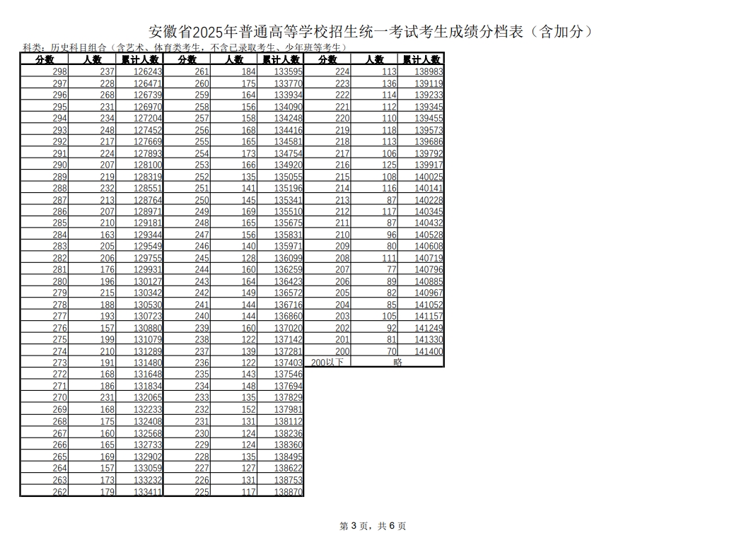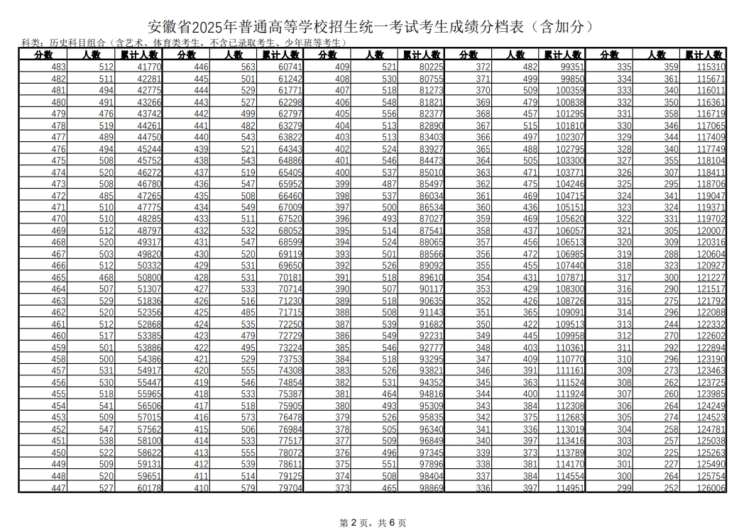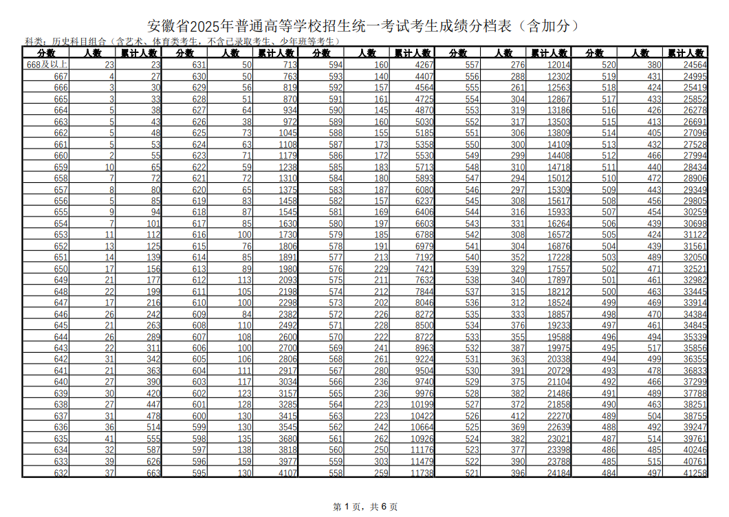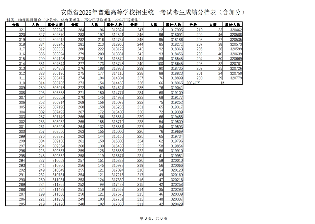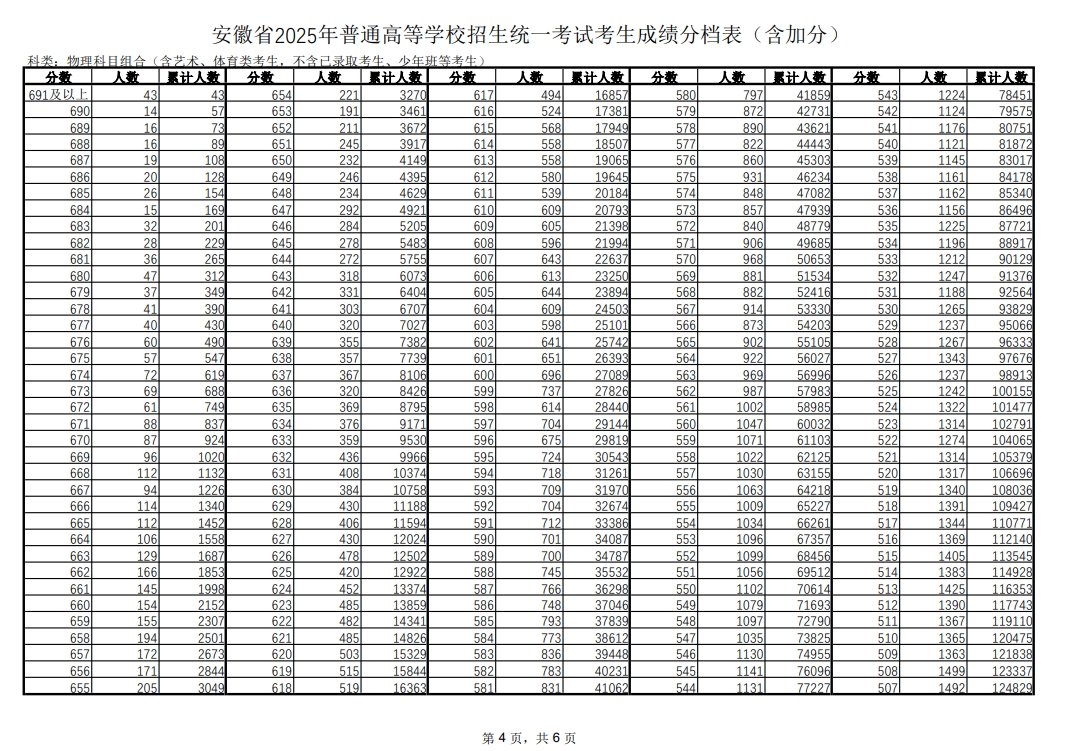 来源:安徽考试院 安徽省2025年普通高等学校招生统一考试考生成绩分档表(含加分)