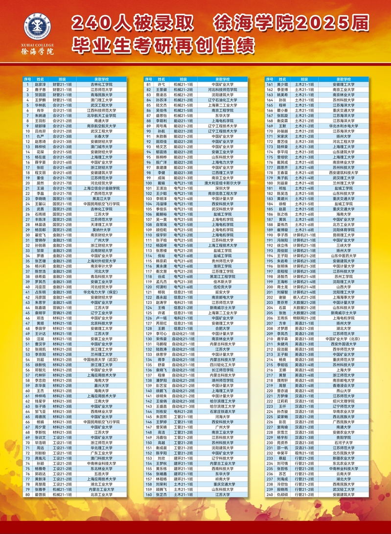 “研”途筑梦争朝夕,青春奋进正当时。近日,徐海学院毕业生考研再传喜讯,在师生的共同努力下,2025届毕业生中共有240人被国内外高校录取为硕士研究生,整体录取率达11.07%。除考取中国矿业大学外,多名学子被北京科技大学、南京航空航天大学、河海大学、新南威尔士大学、莫纳什大学等国内外知名高校录取。