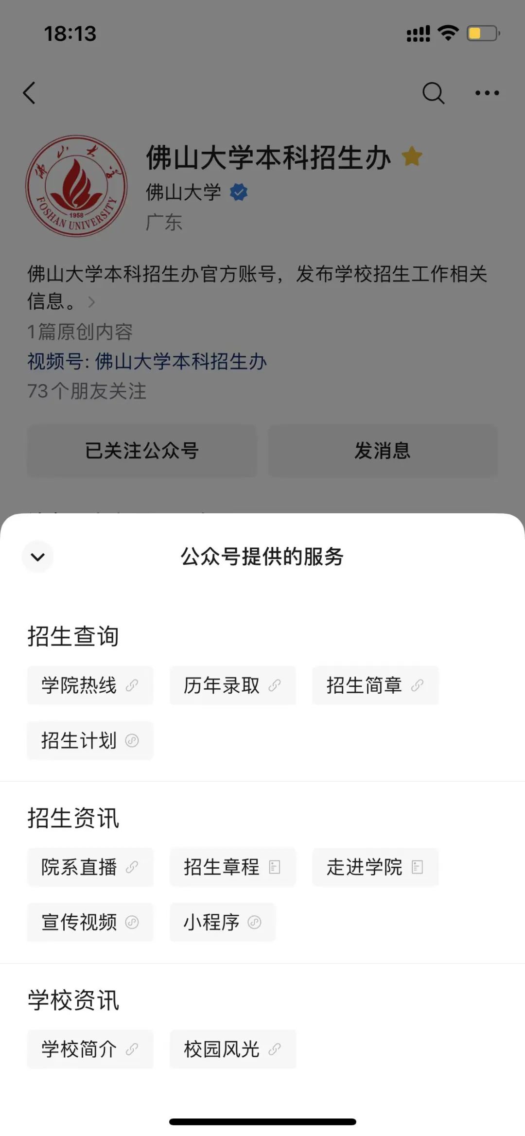 关注“佛山大学本科招生办”微信公众号,点击菜单栏“招生资讯-院系直播”,即可进入活动回放,10大专题,19个学院(部)老师为你揭秘佛大专业!