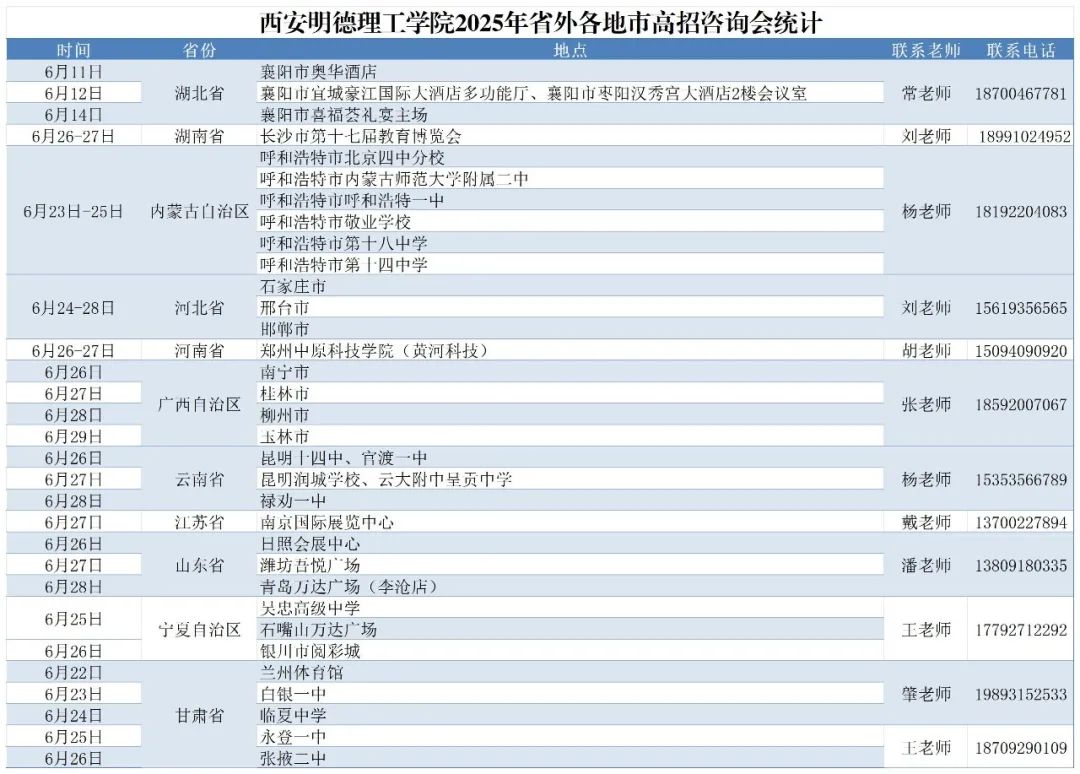 高考出分在即,为帮助2025年高考考生及家长充分了解我校招生情况、理性填报志愿,现将我校2025年参加全国各省招生咨询会行程公布如下: