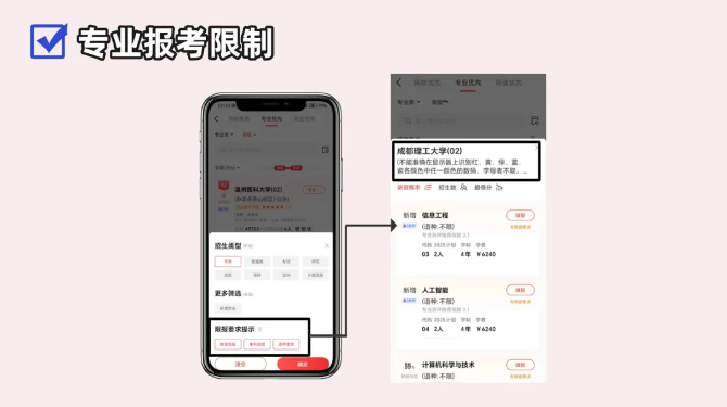 为了避免这样的情况发生,考生可以选择上方筛选栏中的【高级】-【限报要求提示】,通过选中这些限制条件,考生将会在推荐结果中看到针对性提示,避开填报这些院校专业,从而更科学、合理地进行志愿填报。