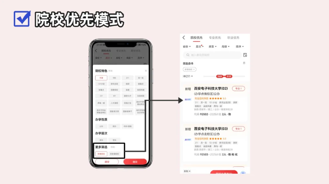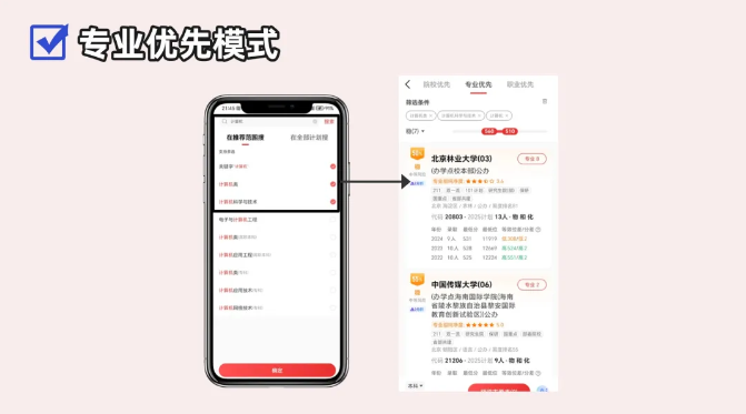 这个模式以专业为导向,更适合有目标专业的考生选择。考生可以根据自己的实际情况选择感兴趣的专业,通过专业筛选院校。