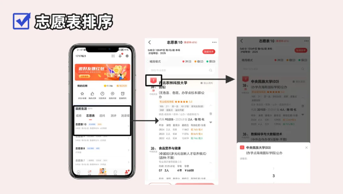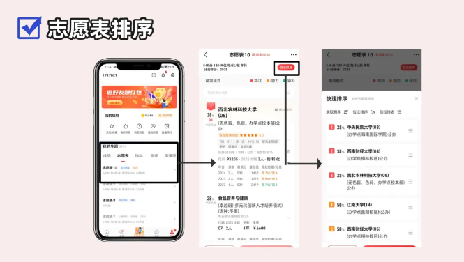 (1)在【我的】-【志愿表】中,点开生成的志愿表,然后点击右上方的【快速排序】选项,之后只要长按需要调整的志愿,即可进行排序。