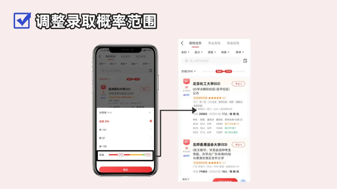 推荐结果分为“稳、冲、保”三种类型,考生可以根据自己的情况安排志愿梯度,有效帮助考生降低填报风险。此外,考生还可通过调节系统测算的录取概率范围,进一步筛选推荐结果。