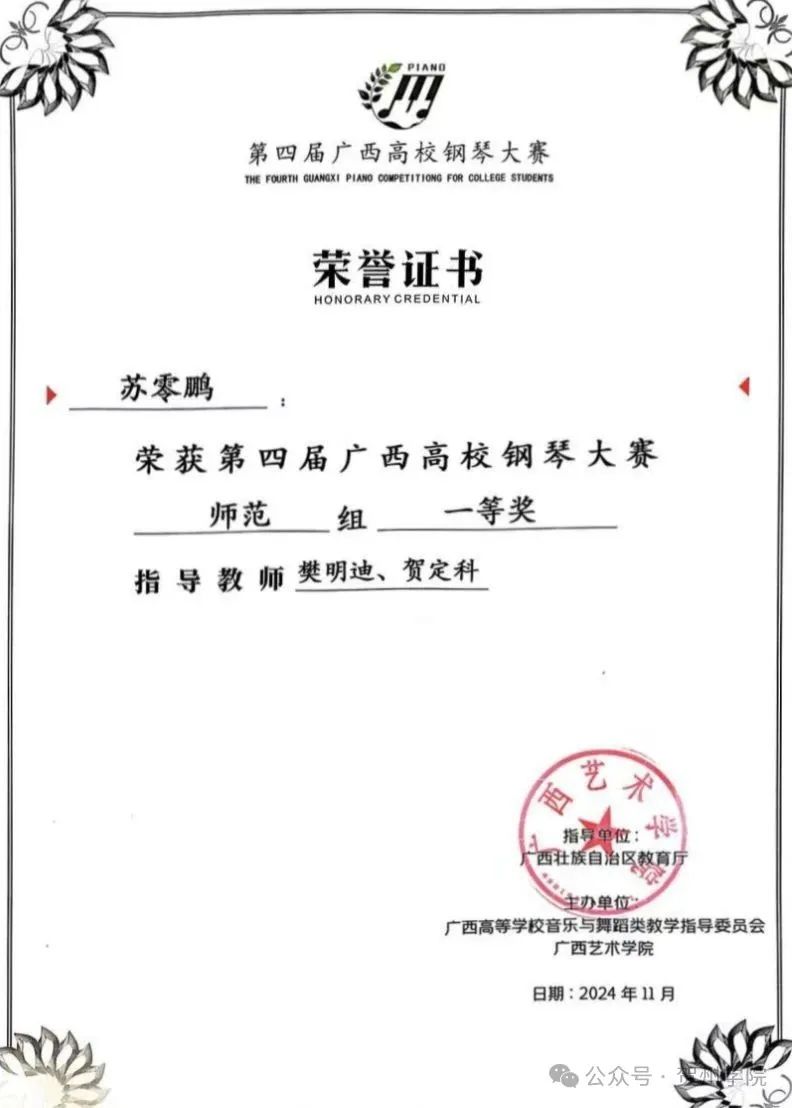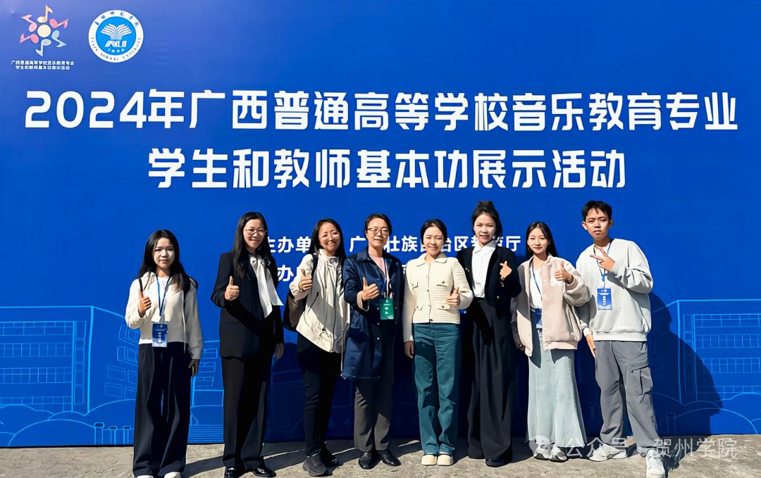 音乐学专业的师生在2024年广西普通高等学校音乐教育专业学生和教师基本功展示中获本科组团体三等奖;学生获本科组个人全能奖二等奖2项、个人单项奖二等奖1项、三等奖2项;教师获本科组个人全能奖一等奖1项、二等奖1项、三等奖1项,个人单项奖一等奖1项、二等奖2项