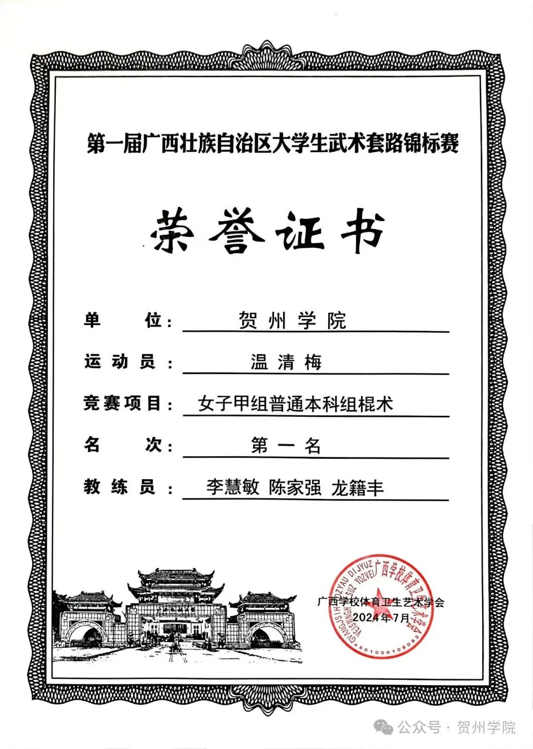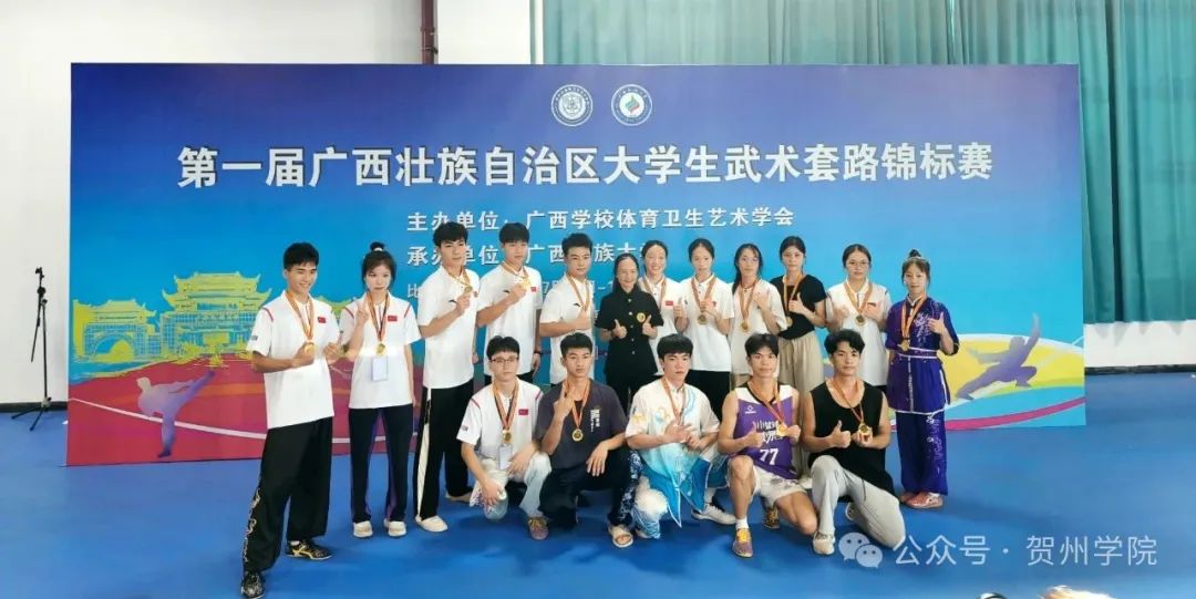 学生参加第一届广西壮族自治区大学生武术套路锦标赛,获男子丙组体育专业组四类拳术第一名、女子甲组普通本科组棍术第一名