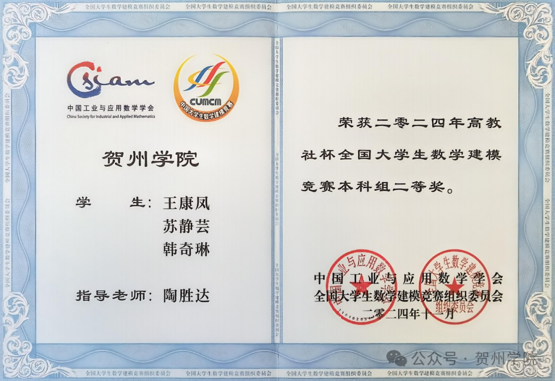 学院学生参加2024年全国大学生数学建模竞赛获本科组二等奖