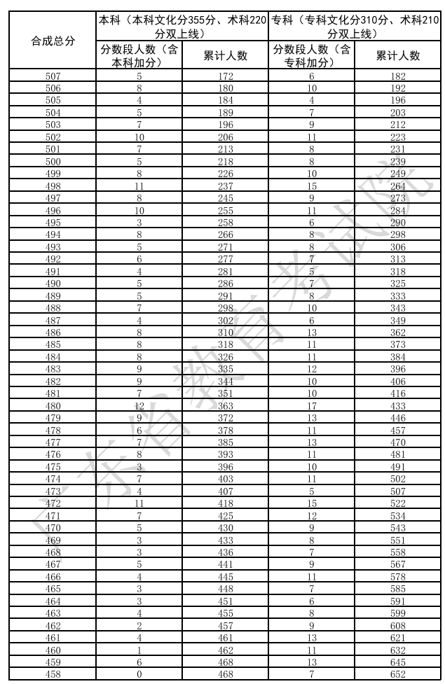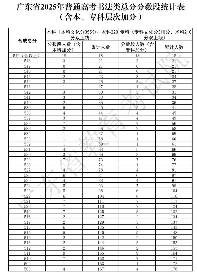 来源:广东省教育考试院 广东省2025年普通高考体育类总分分数段统计表(含本、专科层次加分)