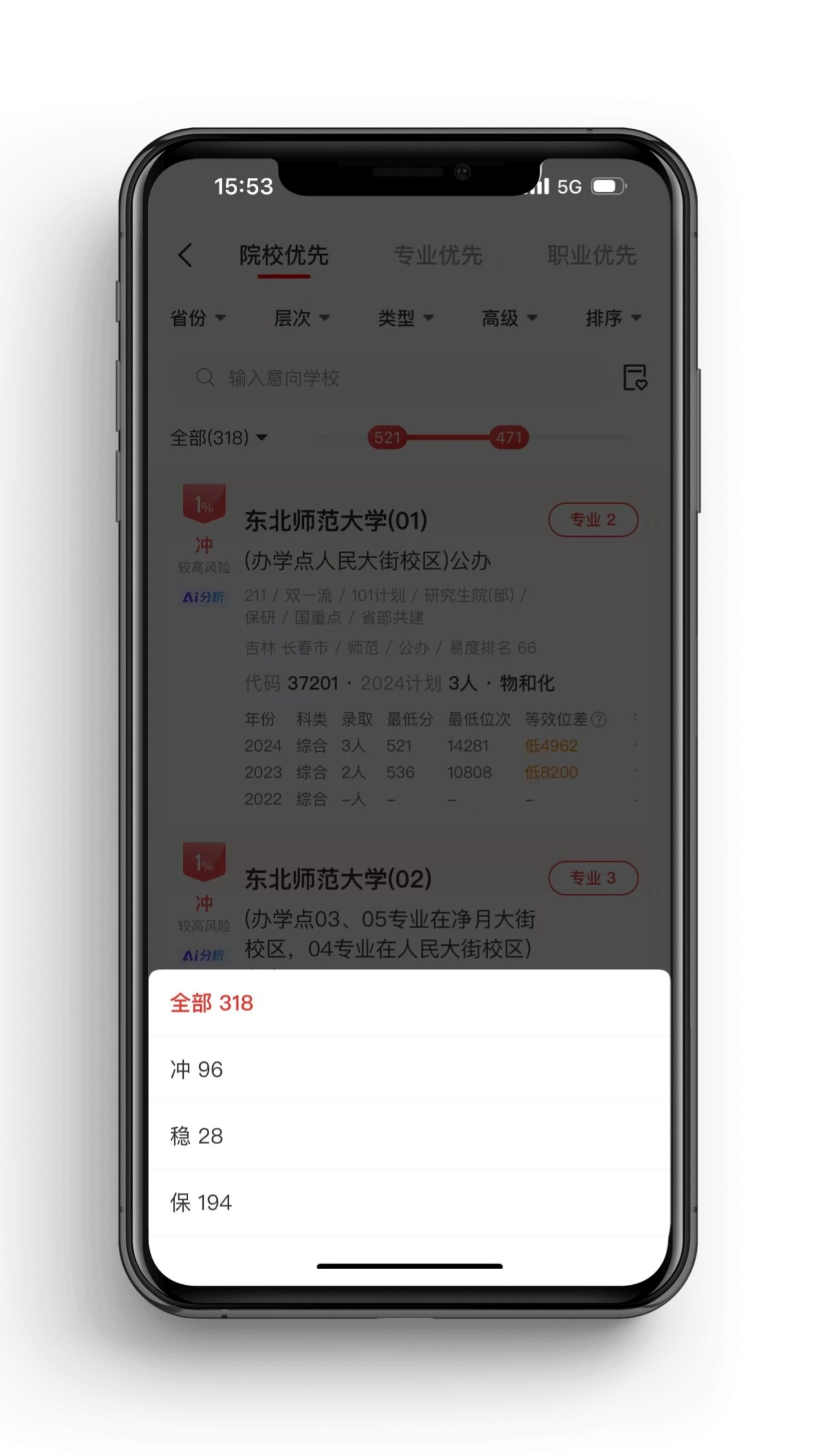 使用优志愿的院校优先填报功能,考生输入高考成绩后,即可获得个性化的院校推荐列表。该功能将志愿划分为三个层次,助力考生制定科学的志愿填报策略。