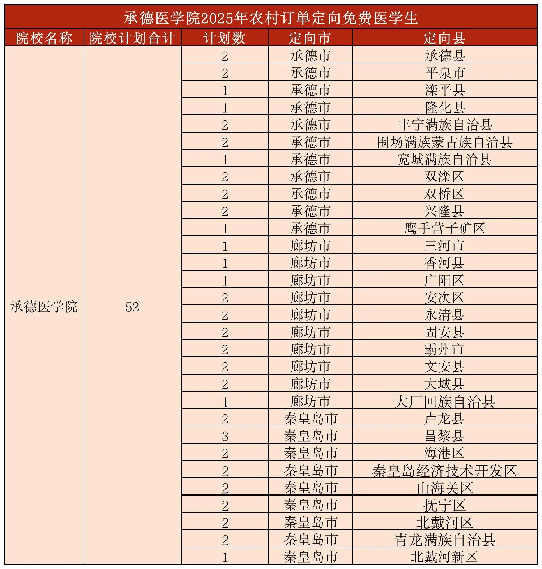 2025年我校面向全国28个省(市、自治区)招生,招生层次为普通本科,招生计划2040人,河北省内招生1870人,省外招生170人。无专科、单招和对口招生计划。继续在黑龙江安排对等交换招生计划(护理学专业本科,招收能接受蒙语授课的蒙古族考生)。河北省内1870人中包括农村订单定向免费医学生52人(临床医学专业本科),河北省内本科招生计划分为两个批次,即本科提前批B段的农村订单定向免费医学生计划和普通本科批次计划。