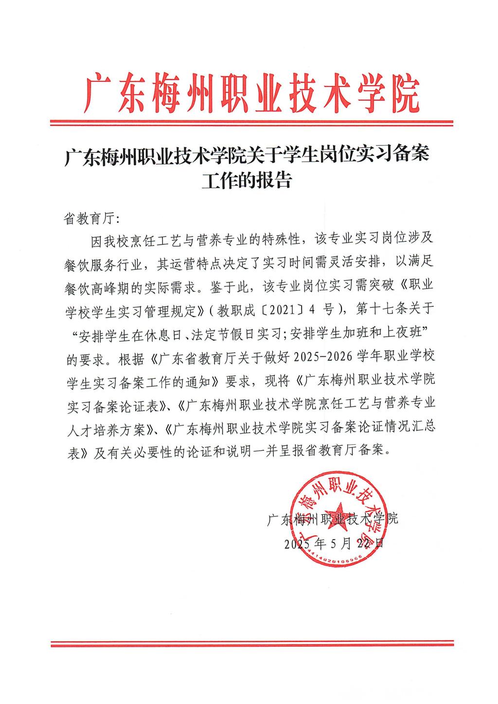 广东梅州职业技术学院 2025-2026 学年突破规定实习备案