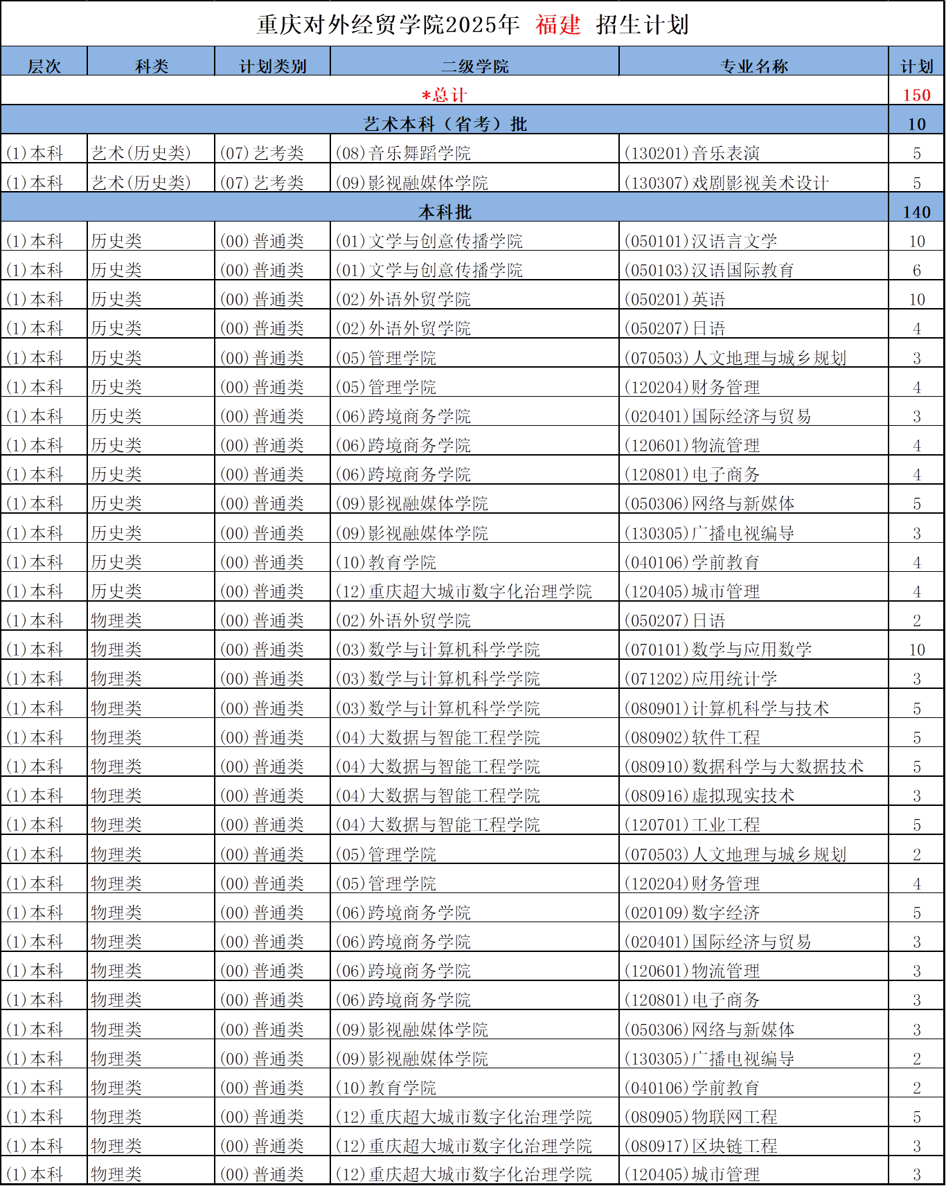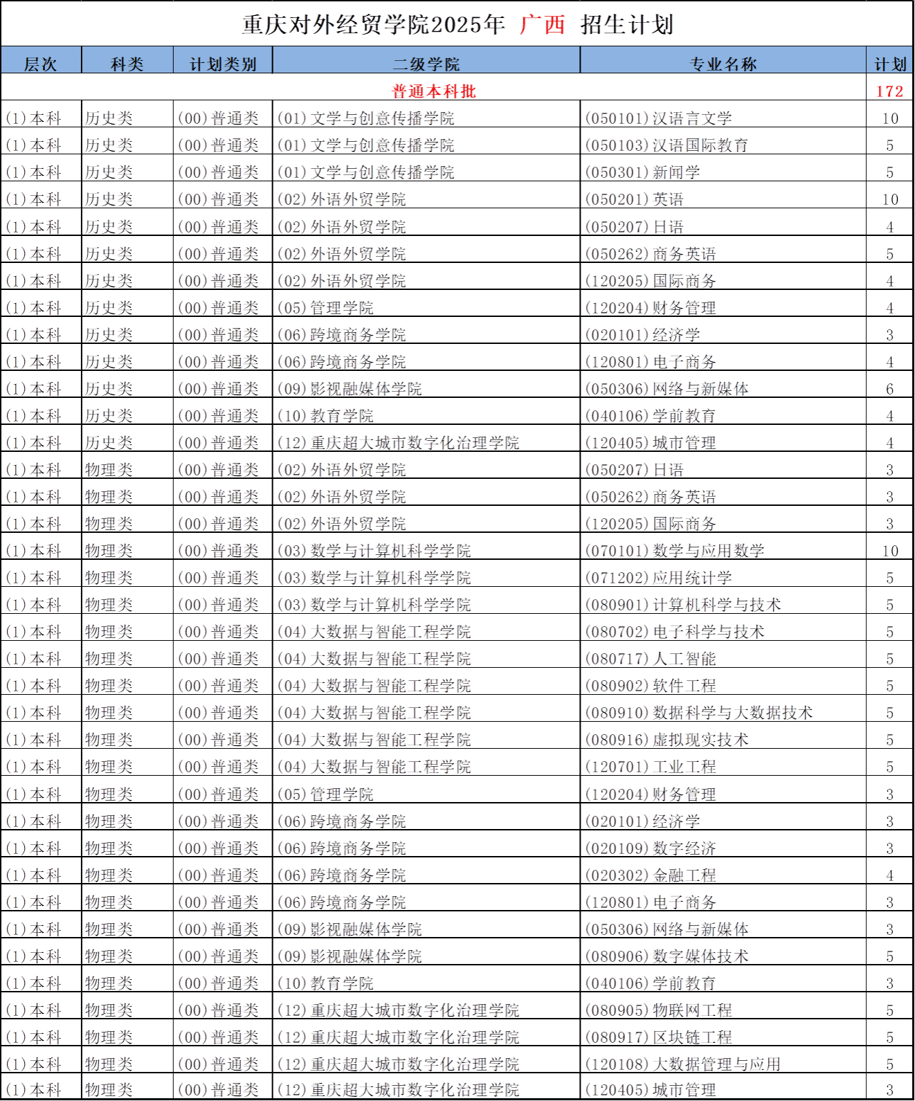 重庆对外经贸学院2025年福建-广西-广东招生计划