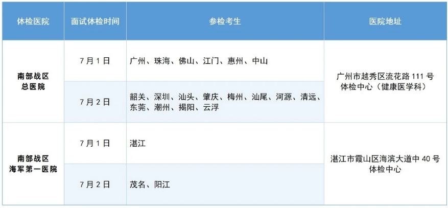 1.湛江片区考生到达南部战区海军第一医院后,按工作人员指引进行面试体检。广州片区考生从南部战区总医院门诊部进入医院,按规定时间前往体检中心(健康