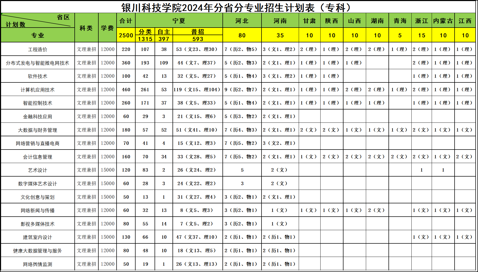 银川科技学院2024年分省分专业计划表(专科)