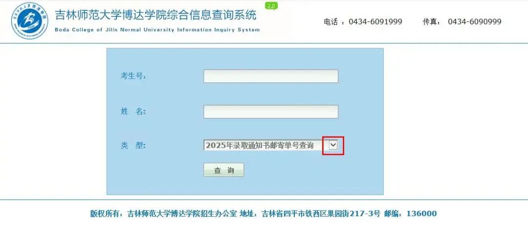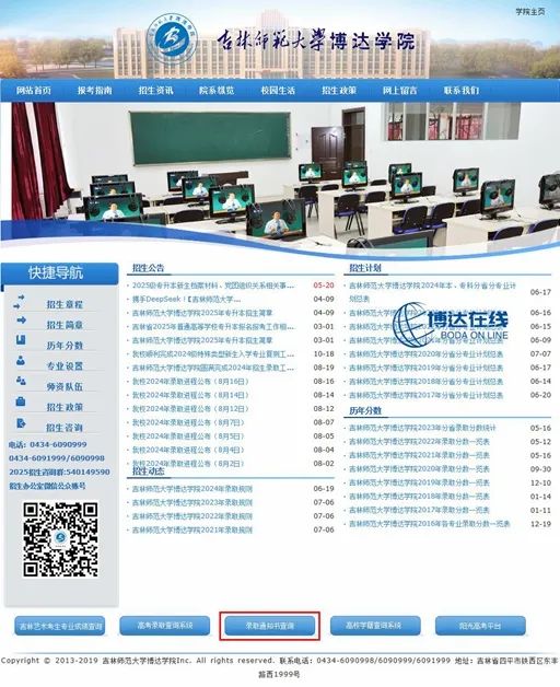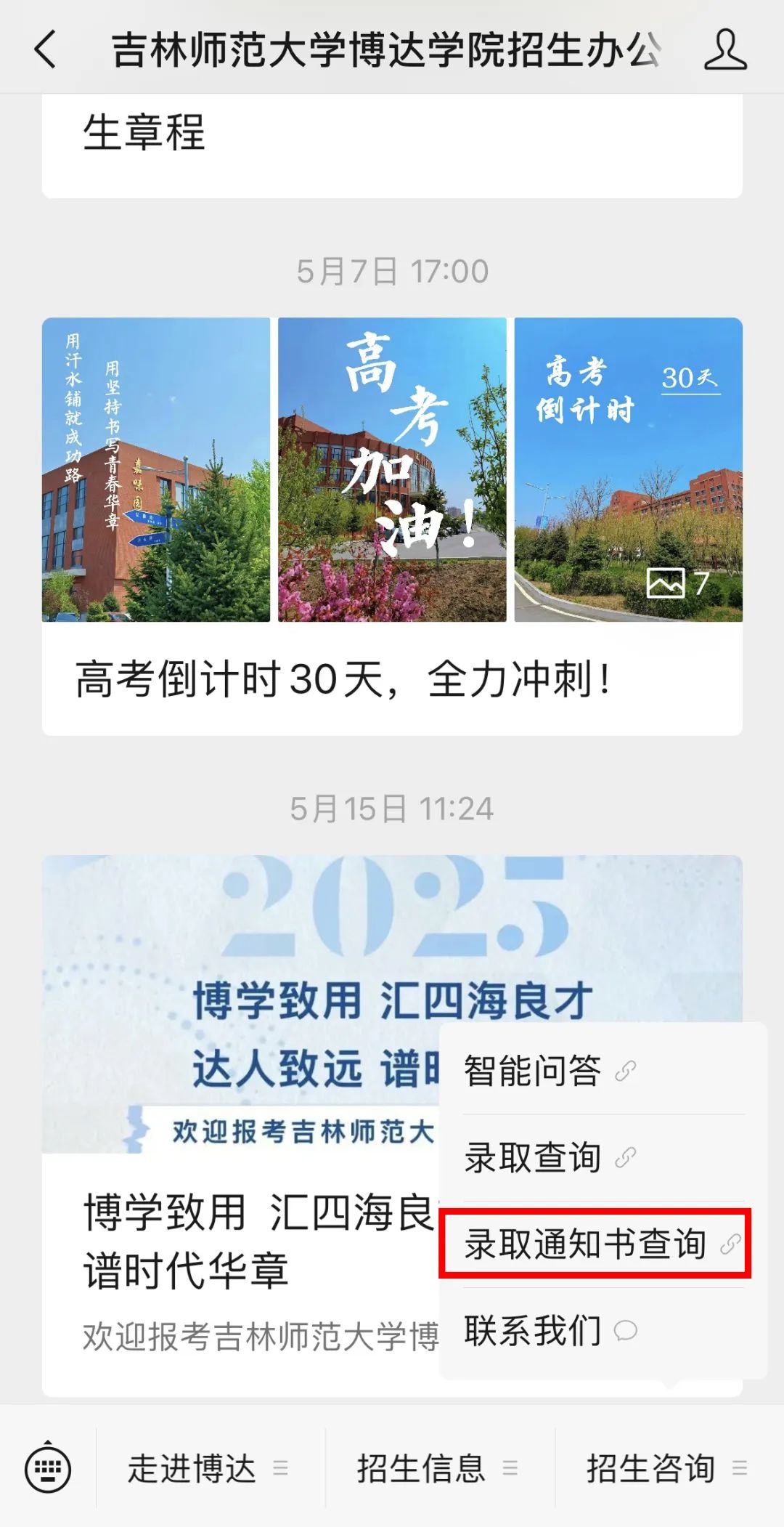 2、微信关注“吉林师范大学博达学院招生办公室”微信公众号,点击下方菜单栏中招生咨询—录取通知书查询。