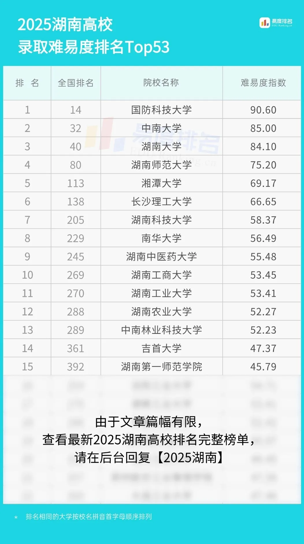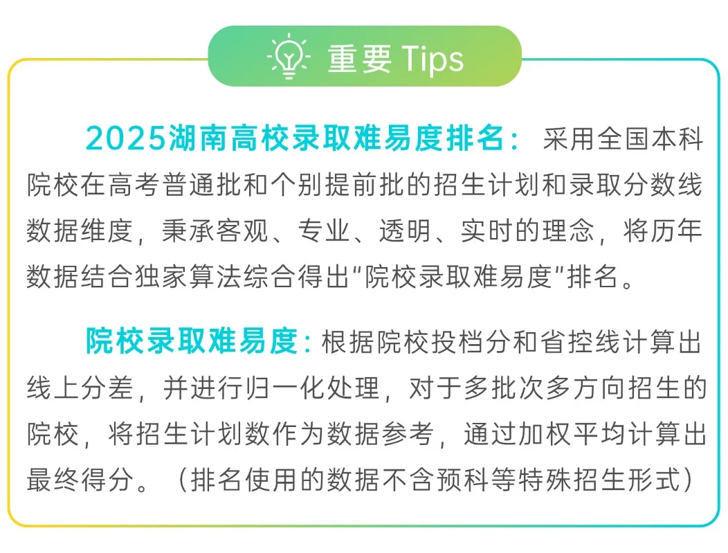 各分段考生可根据难易度指数选择适合自己的学校。如需查看53所院校的完整榜单,可关注【易度排名】公众号,后台私信回复“2025湖南”。