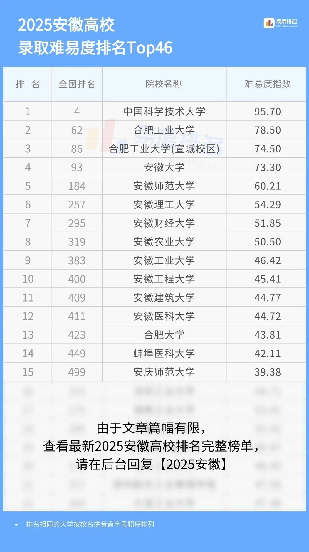 各分段考生可根据难易度指数选择适合自己的学校。如需查看46所院校的完整榜单,可关注【易度排名】公众号,后台私信回复“2025安徽”。