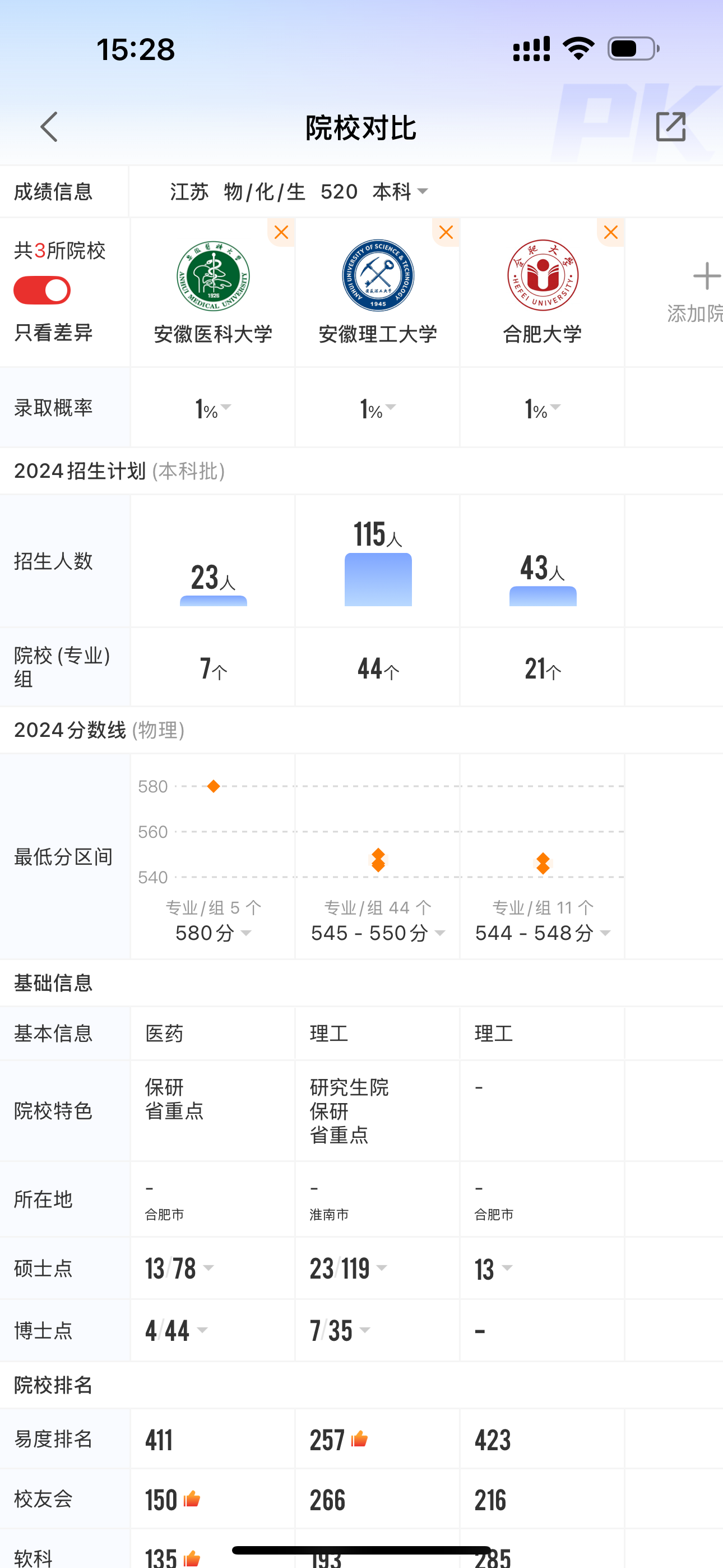 想具体对比上述大学的录取概率、招生情况等多维度信息,可以使用优志愿APP,使用院校对比功能,能帮助你了解更多院校情况,找到适合自己的院校与专业。