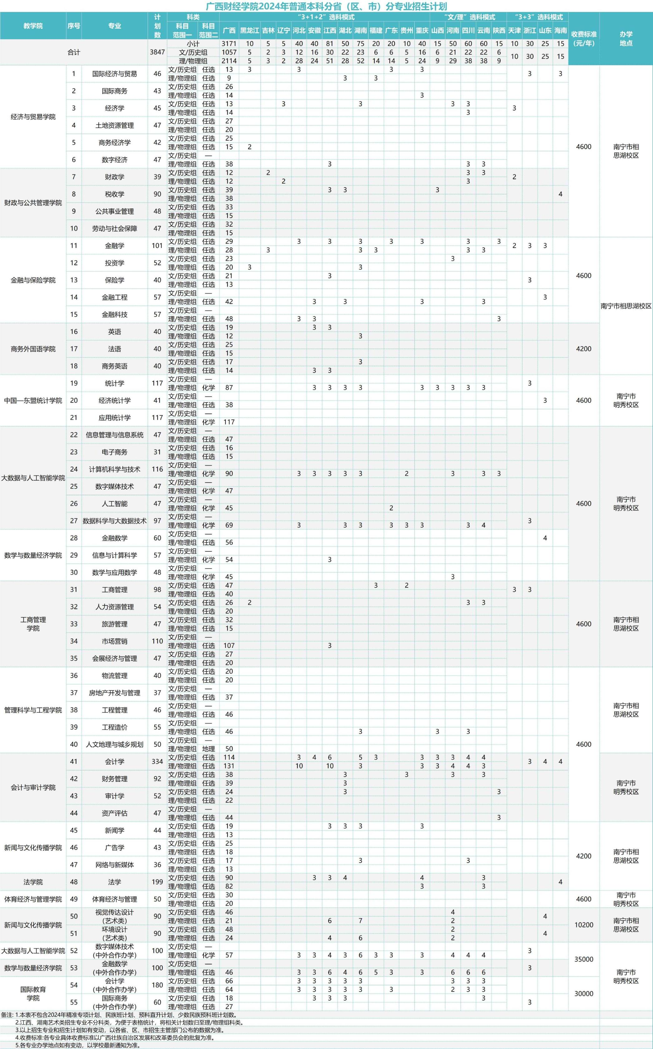 广西财经学院2024年普通本科分省(区、市)分专业招生计划