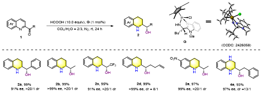 据殷勤介绍,该研究成功开发了一种高效的C2-酰基取代喹啉及喹喔啉连续不对称转移氢化新方法,能够以优异的产率、对映选择性和非对映选择性合成一系列结构新颖的手性1,2,3,4-四氢喹啉(THQs)及四氢喹喔啉衍生物,这些分子同时具有环内与环外相邻手性中心,显著地扩展了氮杂环化学空间。该技术的核心突破在于采用一种水溶性手性氨基苯并咪唑铱催化剂,可依次还原羰基与氮杂芳环。机理研究表明,两个还原步骤均由催化剂精准控制,且未涉及动态动力学拆分过程。该方法可以实现手性四氢喹啉全部四种立体异构体的可控合成。目前团队正在将此连续还原策略拓展至其他氮杂芳环体系,寻求为手性氮杂环化合物的化学空间拓展提供新范式。文章链接: