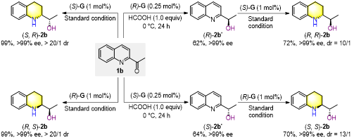 机理实验证实反应遵循“先羰基后喹啉骨架”的级联还原路径,且各步立体化学均由催化剂主导调控。尤为重要的是,通过控制反应温度和还原剂用量,可实现中间体手性醇的可控合成,进一步调控催化剂的绝对构型,可获得手性四氢喹啉产物的全部四种立体异构体。