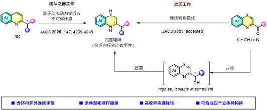 基于上述研究基础和团队拓展手性氮杂环化合物(NHCs)新化学空间的长期研究兴趣,殷勤团队提出了新目标:从更加简单的底物出发实现四氢喹啉四个立体异构体的发散性合成。针对此目标,团队提出了“C2-酰基取代喹啉连续不对称氢化”新策略,实现羰基和喹啉环的连续还原,从而实现同时具有环内与环外手性中心的新颖手性四氢喹啉(THQs)的高效合成。