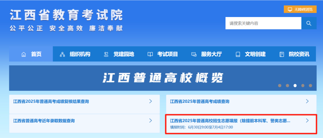 第一步:网站首页点击“江西省2025年普通高校招生志愿填报”链接