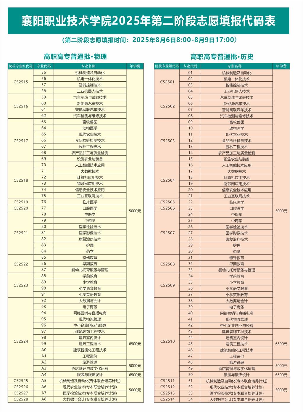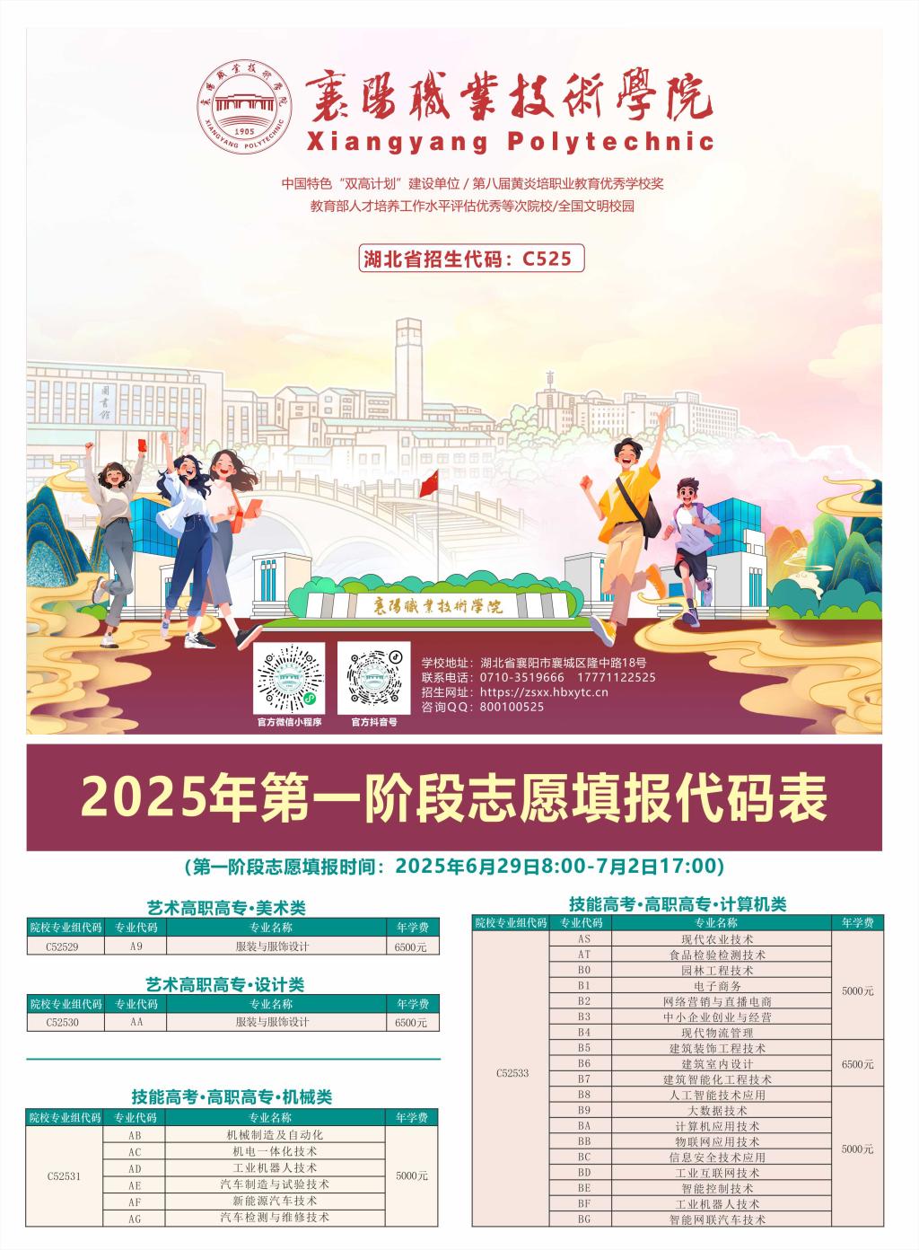 襄阳职业技术学院2025年湖北省内招生专业代码