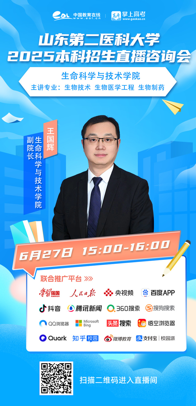 6月27日15:00-16:00,生命科学与技术学院专场,生命科学与技术学院副院长王国辉教授带您全方位深层次了解生物技术、生物医学工程、生物制药专业。