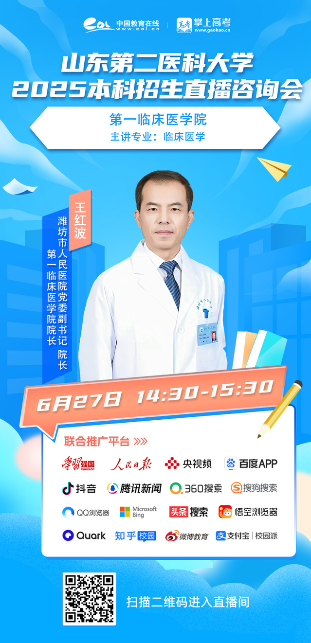 6月27日14:30-15:30,第一临床医学院专场,第一临床医学院院长、潍坊市人民医院党委副书记、院长王红波教授带您全方位深层次了解临床医学专业。