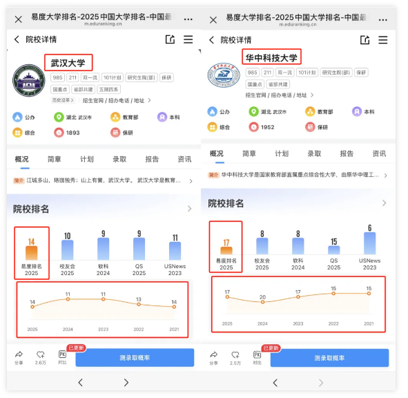 3、例如,想知道武汉大学和华中科技大学谁更难考,可在搜索栏中分别输入两所学校名称,即可得到2025年最新排名,武汉大学排名14,华中科技大学排名17,可得武汉大学比华中科技大学更难考,下方还有历年排名可参考哦~