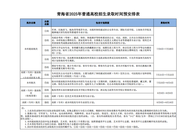 2025年我省普通高校招生录取共设置四个批次,依次为:本科提前批次、本科批、高职(专科)提前批次、高职(专科)批次,各批次设置不同的段,分别投档录取。根据工作安排,现将录取日程安排公布如下: