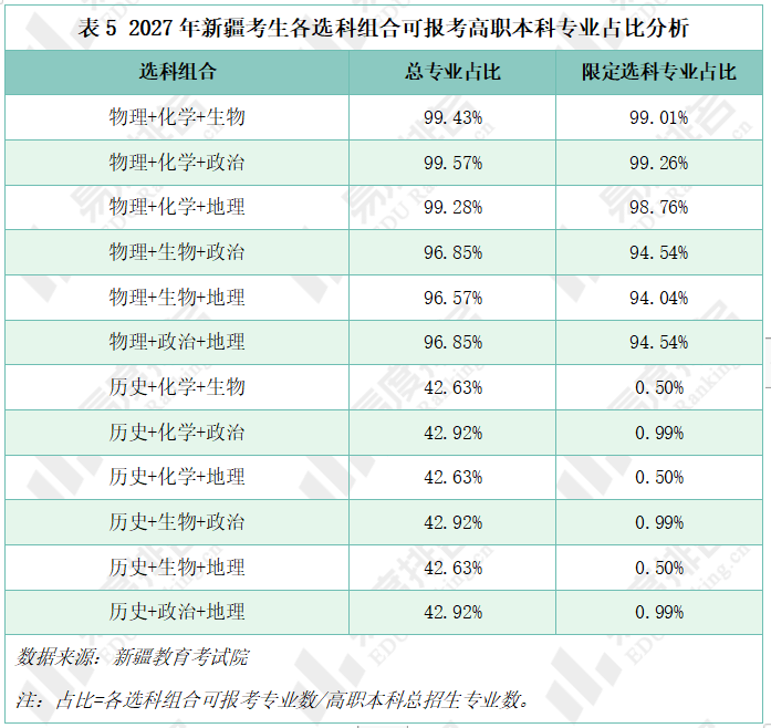 整体来看,2027年新疆高职本科专业选科要求中物理科目占据绝对主导地位,94%以上的限定选科专业均要求选考物理,物理可以说是已成为高职以及本科理工类专业报考不可绕过的硬性要求;相比之下,历史选科组在限定选科专业中的占比均不足1%。
