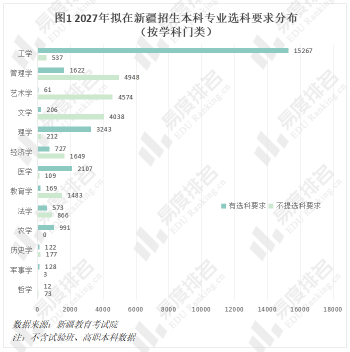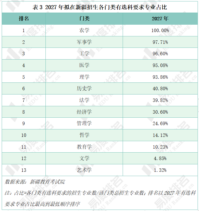 下表为2027年拟在新疆招生各门类有选科要求专业占比数据。有选科限制占比最高的前三专业门类分别是农学、军事学和工学。