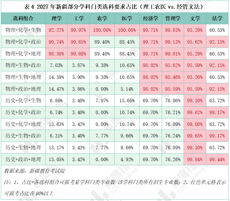 下表为2027年新疆部分学科门类选科要求占比数据。理工医类专业有近90%以上的招生专业有选科要求,这些专业对选科要求多为“物理+化学”。2027年选择此组合的高考生报考工学专业的覆盖率突破99%,基本实现全专业覆盖。“物理+化学+生物”组合则可以报考农学、医学所有专业。相反,非“物理+化学”组合的报考空间被大幅压缩。文科类选科组合在理工农医类专业的报考空间普遍受限,多数组合的占比不足15%。