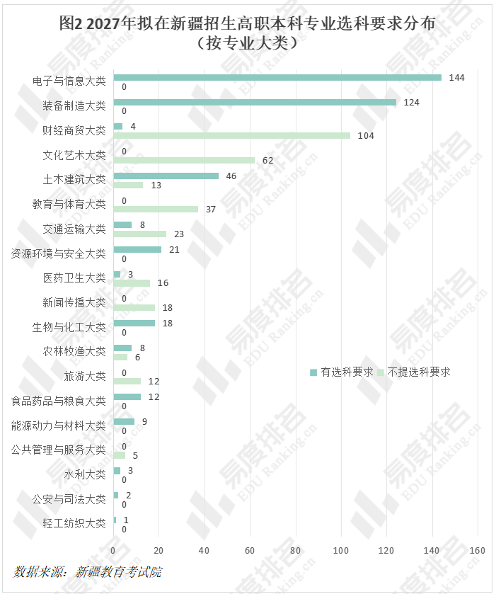 2027年拟在新疆招生的高职本科专业达到699个,招生专业数量较多的分别是电子与信息大类、装备制造大类、财经商贸大类,数量分别是144个、124个、102个专业。